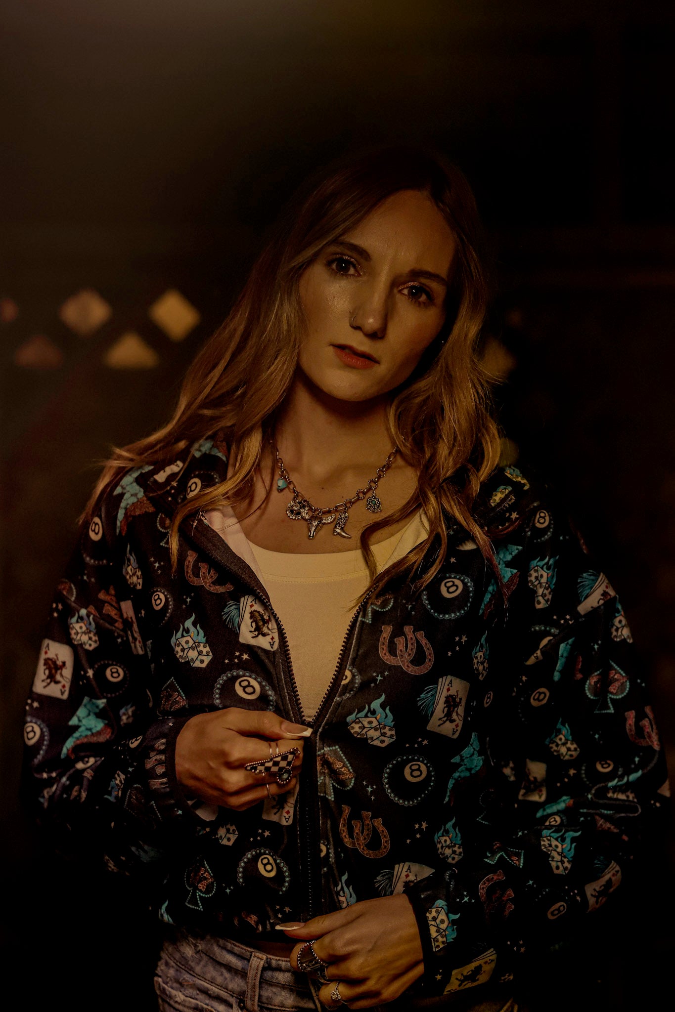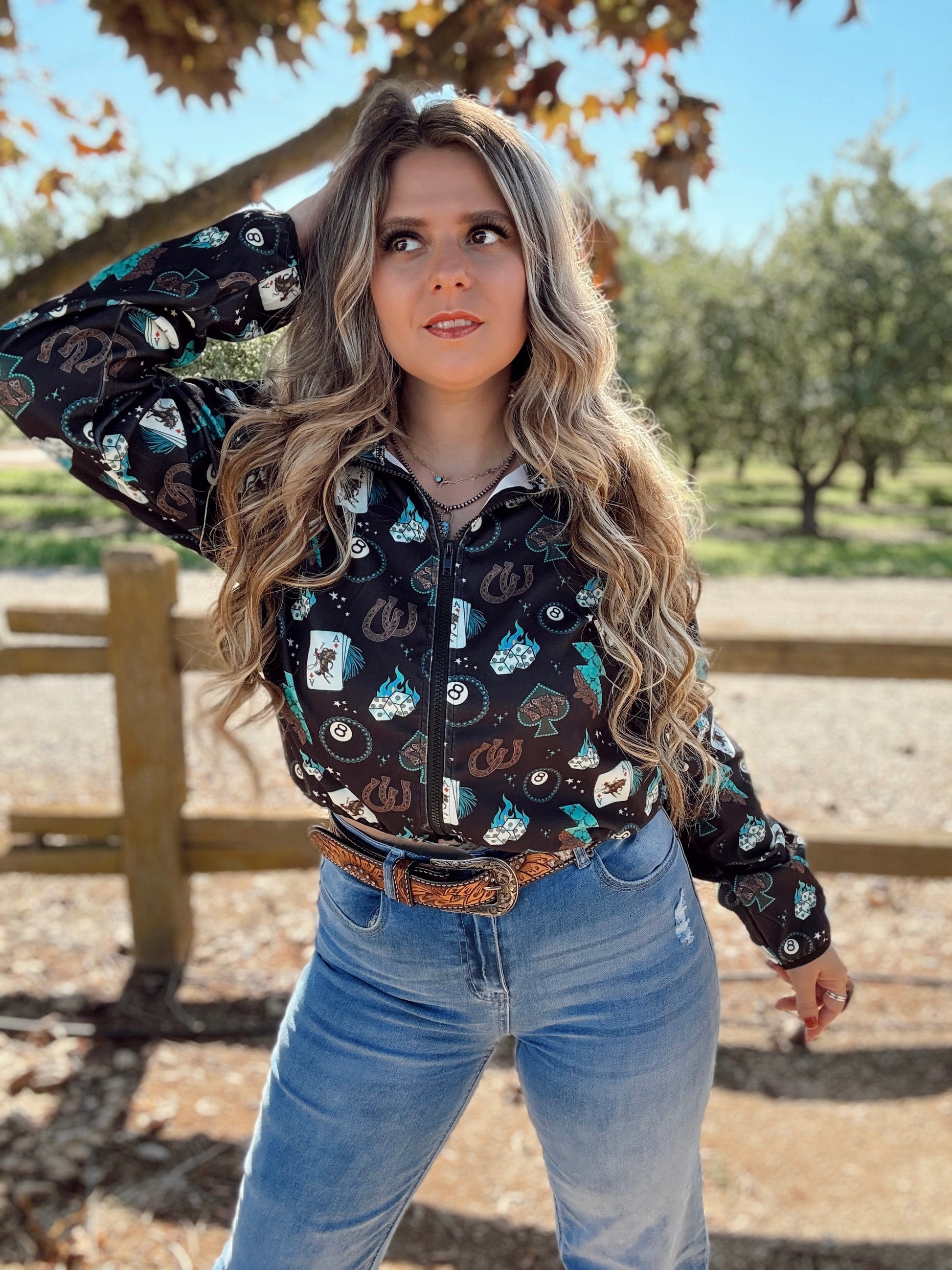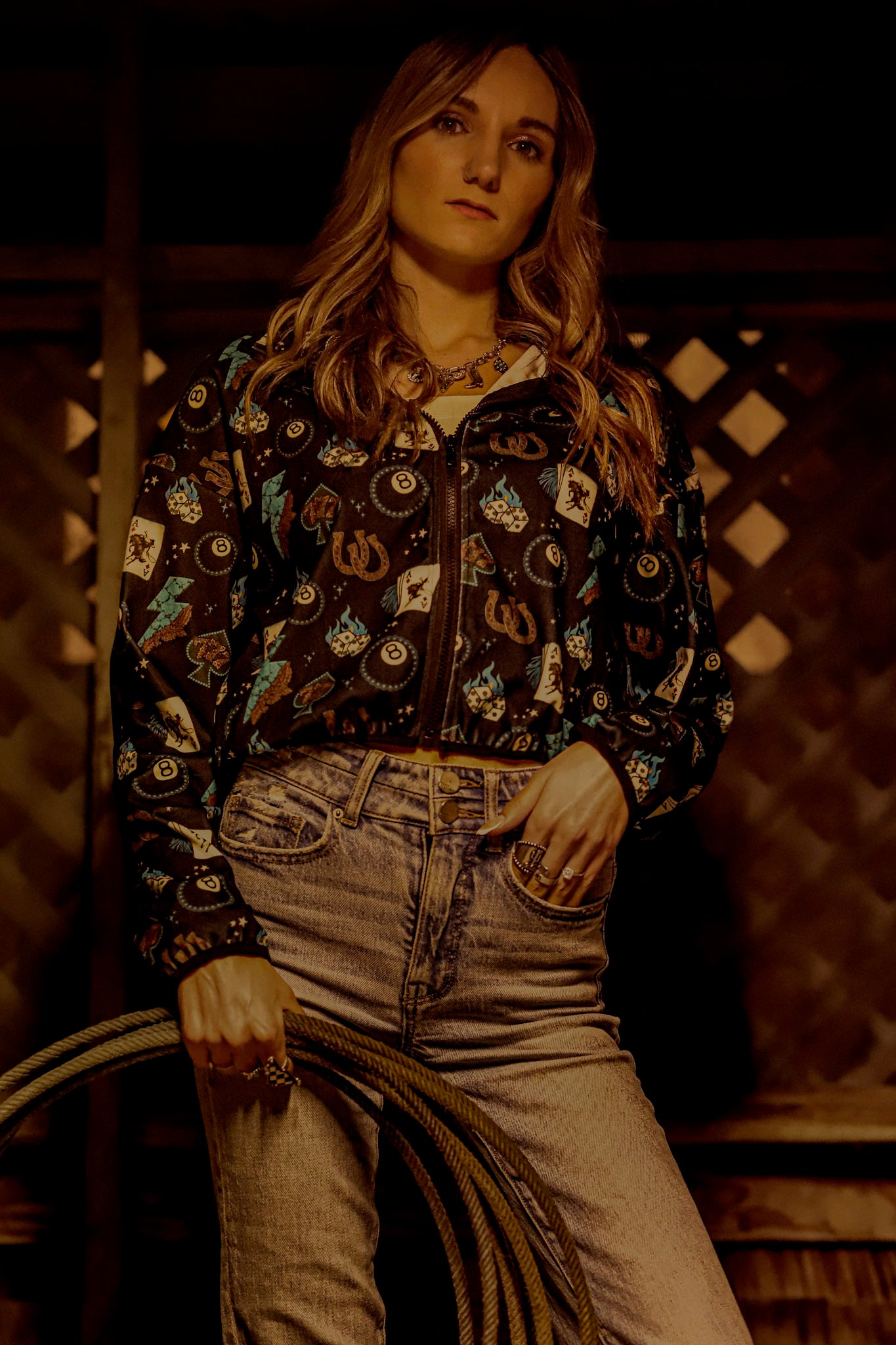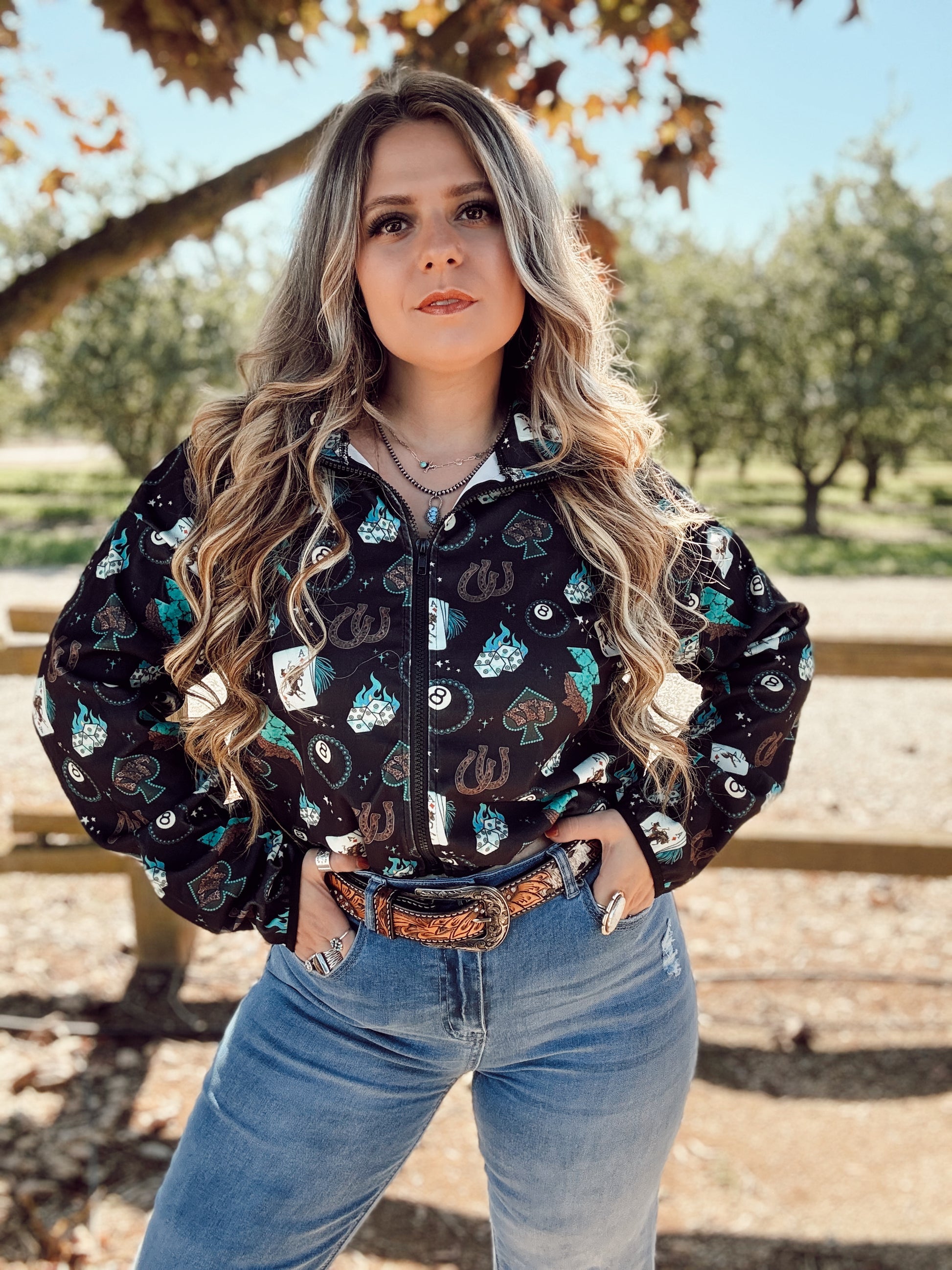 Olivia is wearing a small. Cadence is wearing a XS Make a bold statement with the Cowgirl Charm Cropped Jacket. Featuring iconic symbols like 8 balls, cards, turquoise lightning bolts, horseshoes, dice, and lucky 7’s nestled in a spade, this black zip-up jacket blends edgy style with lucky charm vibes. Its cropped silhouette offers a modern fit that pairs effortlessly with any outfit, perfect for adding a touch of confident flair to your look. 32% Cotton 56% Rayon 12% Spandex SIZE CHEST LENGTH SLEEVE WIDTH SLEEVE LENGTH XS 20" 18.5" 4.5" 20.5" S 20.5" 19" 4.5" 21" M 21.5" 19.5" 4.5" 21.5" L 22" 20" 4.75" 21.75"
