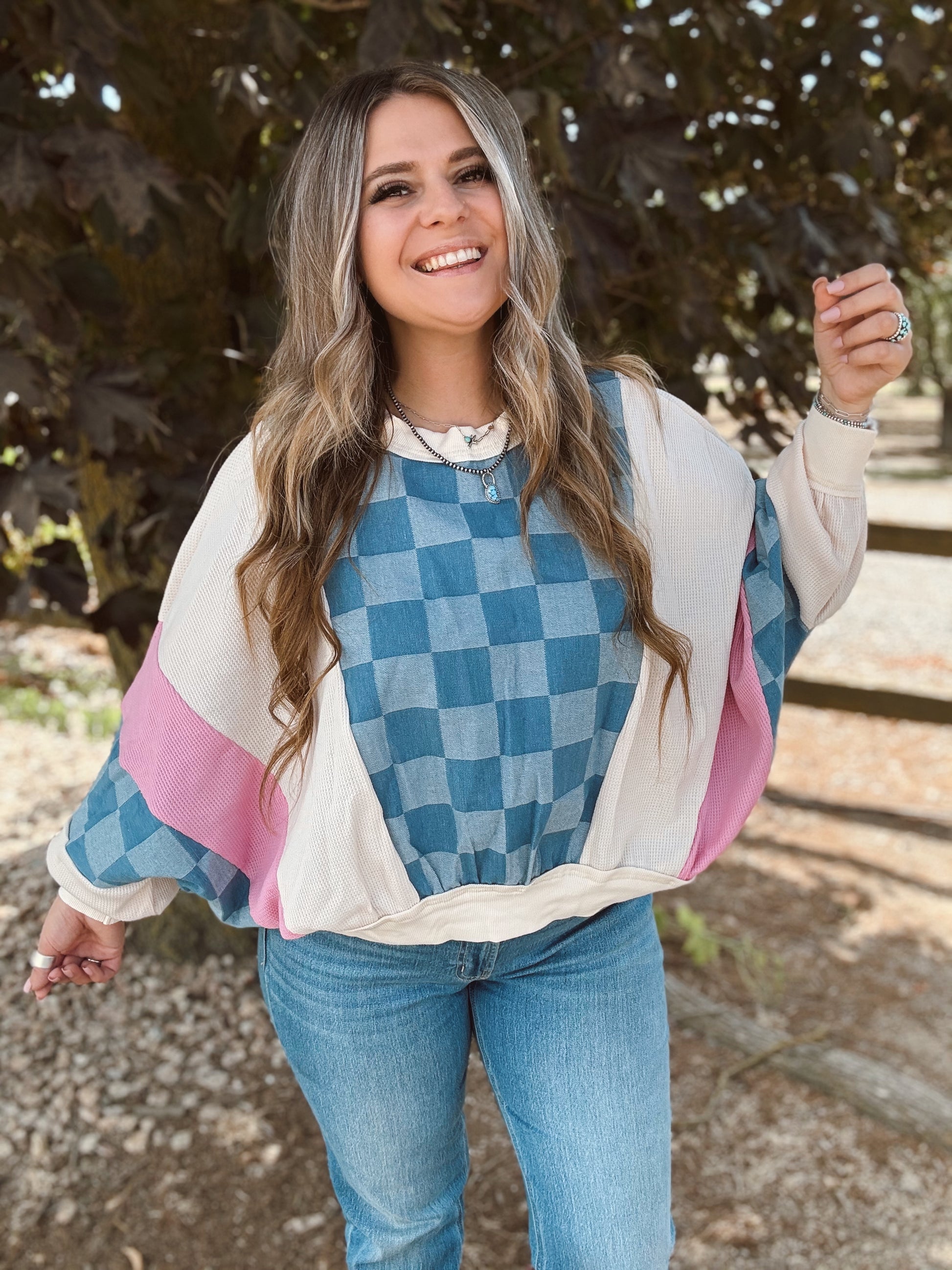 Checkered denim patchwork adds cool, edgy street style vibes. Exposed seam detail gives a trendy raw look to this top. The oversized fit is perfect to give a slim look. The colorblock bubble sleeves make it more fashionable and casual.