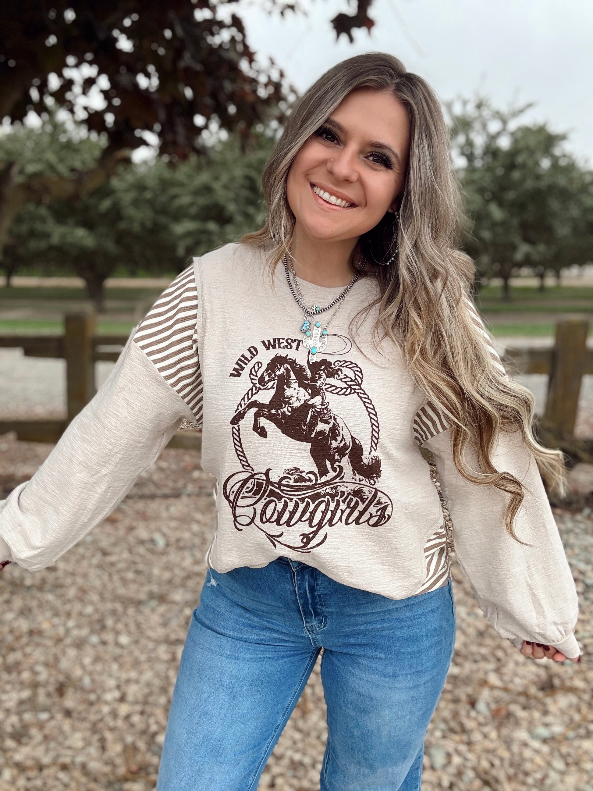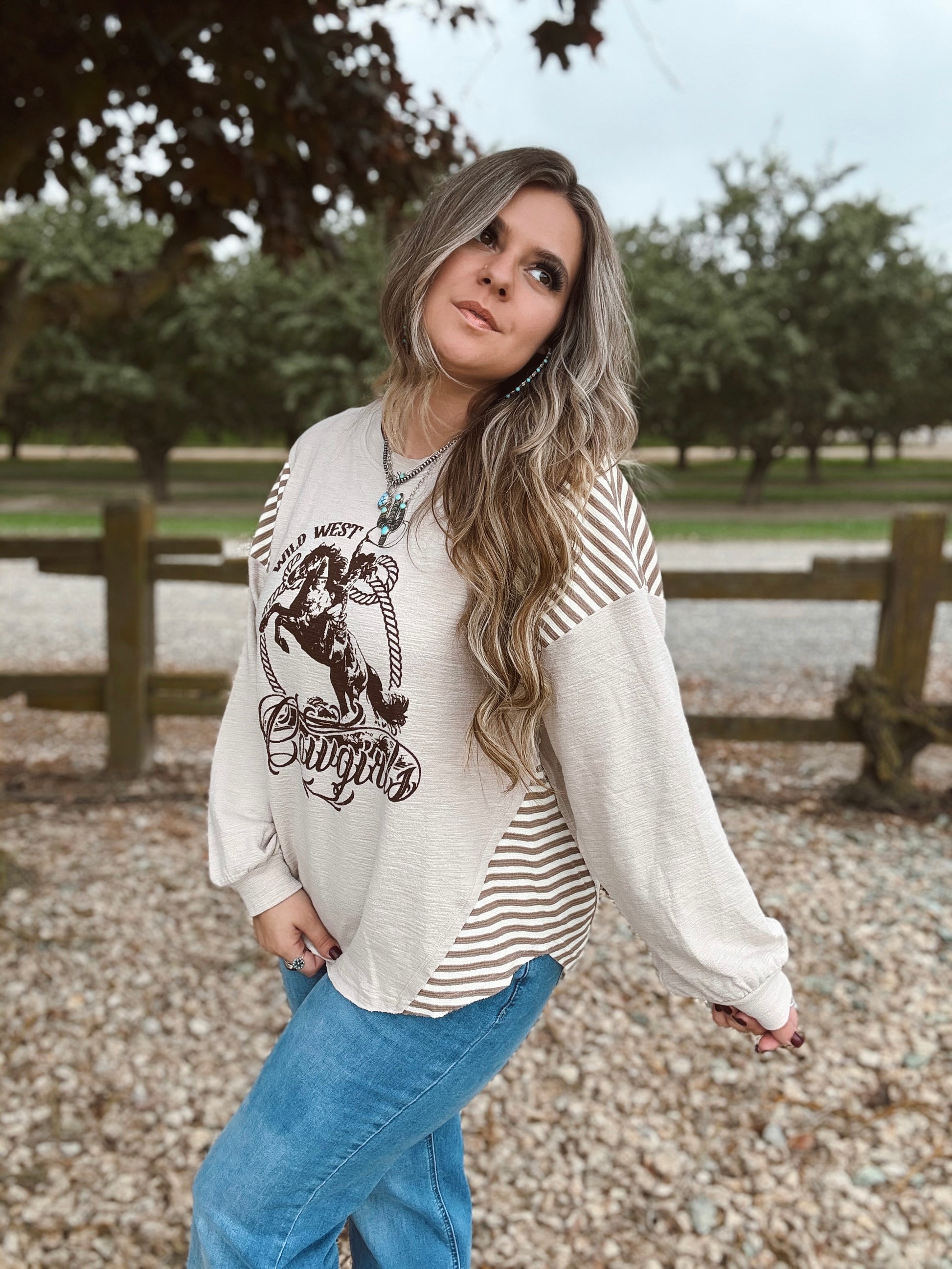 - Oversized Mixed Media Western Graphic Knit Top - Stripe Detail - Round Neck - Drop Shoulder - Long Sleeve - Round Hem